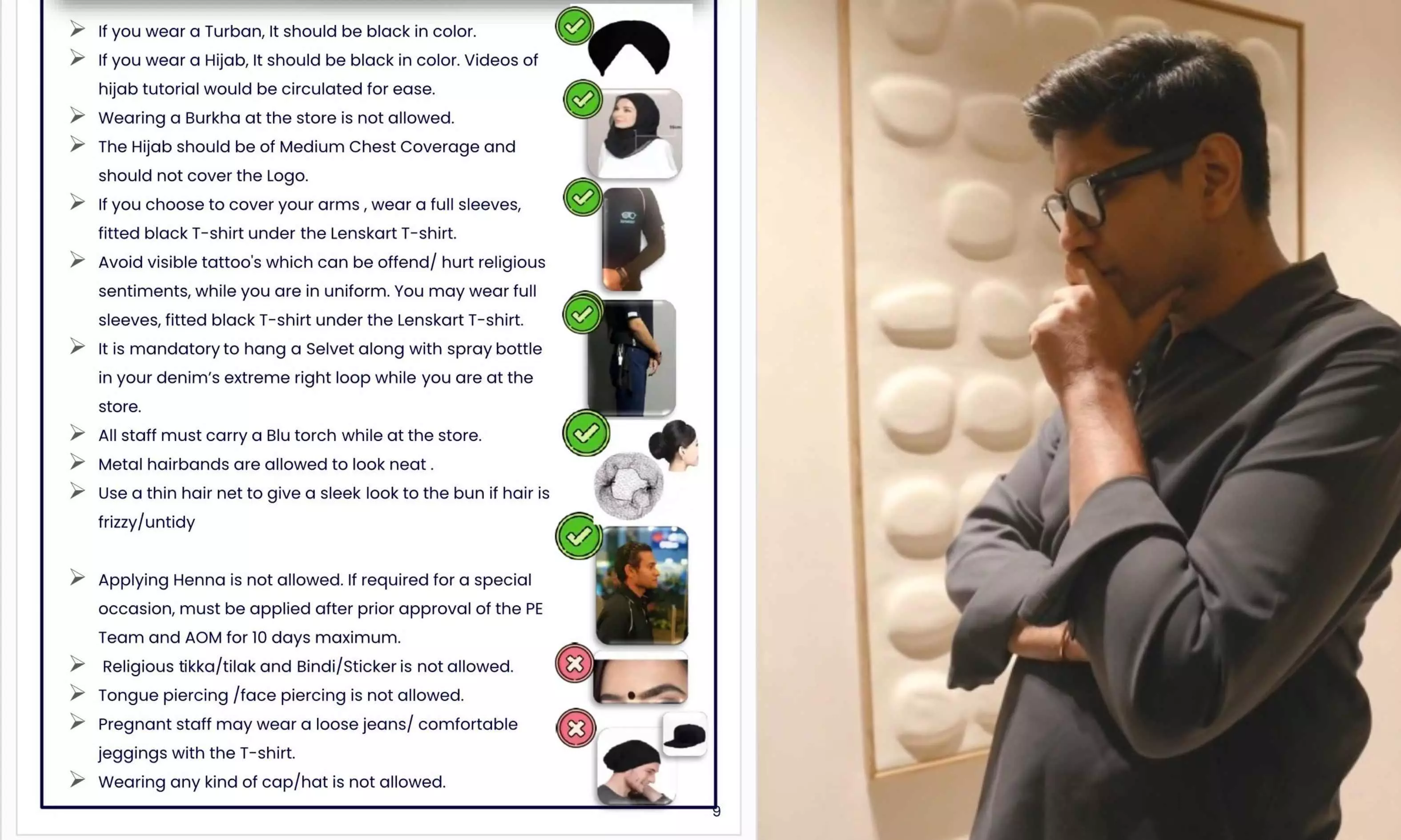 A Lenskart employee grooming guide that reportedly permits staff to wear a black hijab at its stores while banning bindis, tilaks, and kalawas has triggered a sharp backlash online, with users accusing the eyewear retailer of religious bias.
