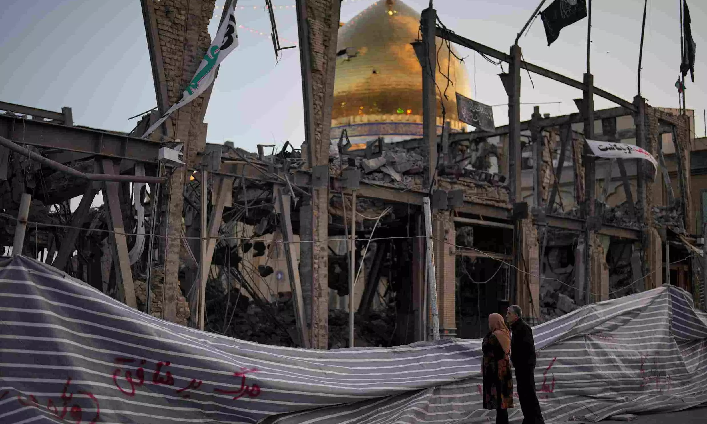 In Zanjan in Iran, pedestrians look at a destroyed building within the Grand Hosseiniyeh, with the mosque visible in the background, which officials at the site say was hit by U.S.-Israeli airstrikes last week. File PTI photo