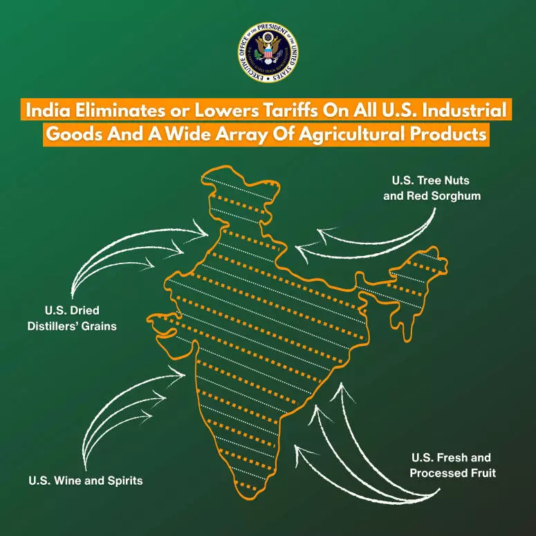 “From tree nuts and dried distillers’ grains to red sorghum and fresh and processed fruit, the US–India Agreement will provide new market access for American products,” the USTR said in a post on X, which featured the India map prominently.