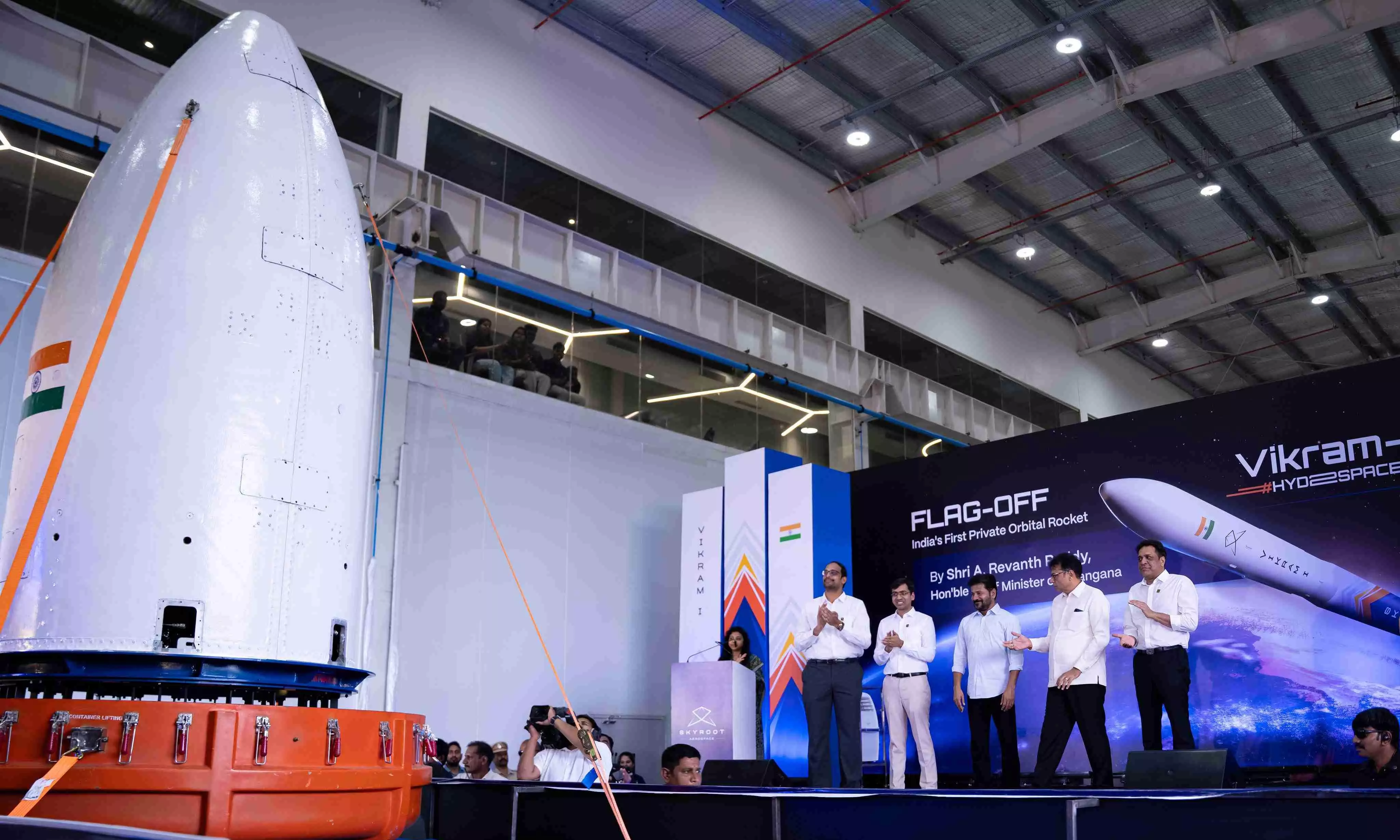 Telangana Chief Minister A Revanth Reddy flags off Vikram-1 from Skyroot's Max-Q campus in Hyderabad on April 25, 2026. Photo: X/Skyroot Aerospace