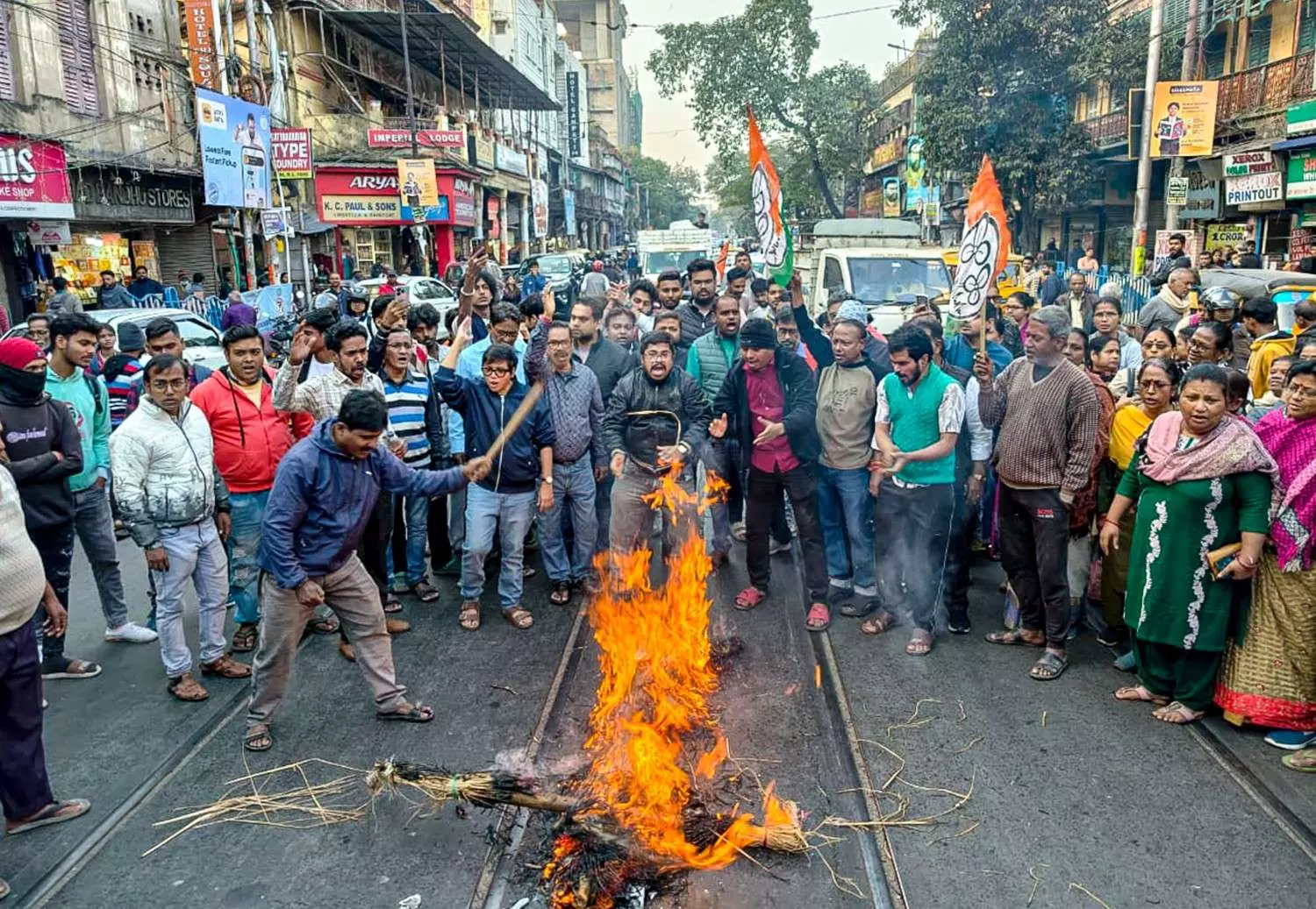 TMC members stage a demonstration against the Enforcement Directorate's (ED) raid at the office of political consultancy firm I-PAC and the home of its director Pratik Jain as part of a money laundering probe into an alleged multi-crore rupee coal pilferage scam, in Kolkata, Thursday, January 8. PTI