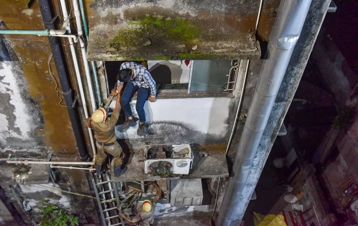 During rescue efforts on Tuesday evening, fire services personnel were seen using hydraulic ladders to transport hapless boarders, who had taken refuge on the hotel rooftop and were left stranded there, to the roof of an adjacent building from where they were brought down to safety.