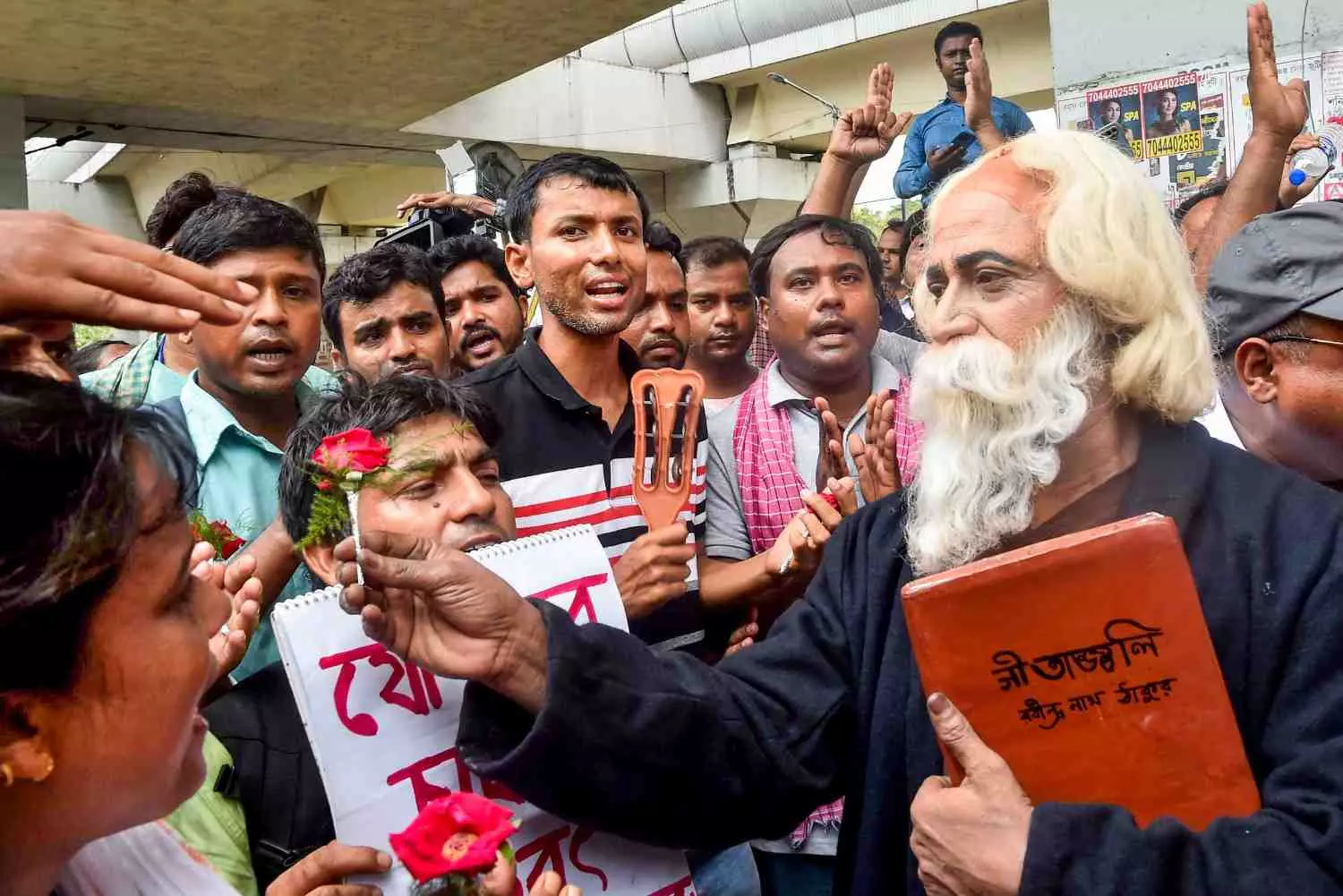 A man dressed as Rabindranath Tagore gives rose to school teachers, who have been rendered jobless following a Supreme Court order, during a protest demanding restoration of their jobs, in Kolkata, Saturday, May 17. PTI