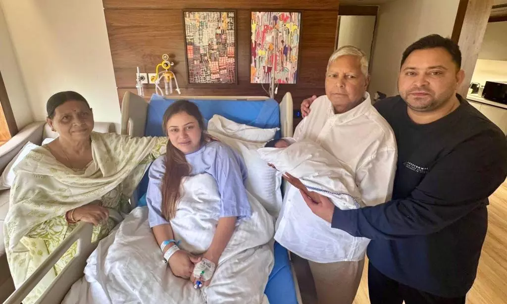 Lalu Prasad and Rabri Devi with Tejashwi, Rajshree and the newborn baby in a Kolkata hospital | Photo: X/@laluprasadrjd