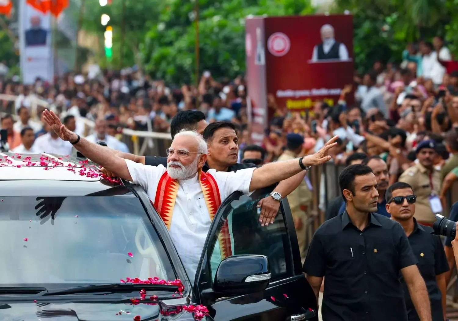 Prime Minister Narendra Modi greets people during a roadshow, in Ahmedabad, Gujarat, on August 25. Photo: PTI