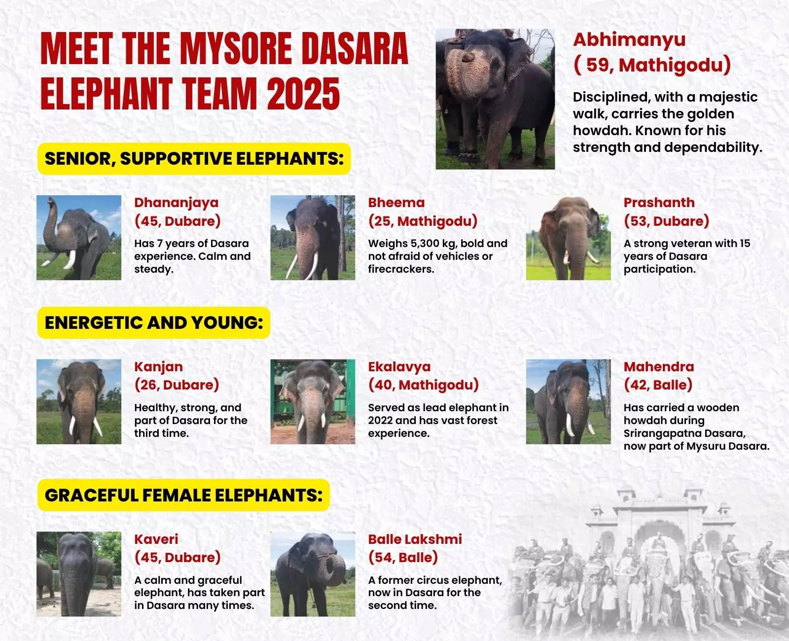 Over the years, elephants like Jayamarthanda, Vijaya Bahadur, Ramprasad, Motilal, Gajendra, Biligiri, Drona, and Airaavata and Balarama, have become famous participating in the Mysuru Dasara for more than 30 times. They all have their own stories.