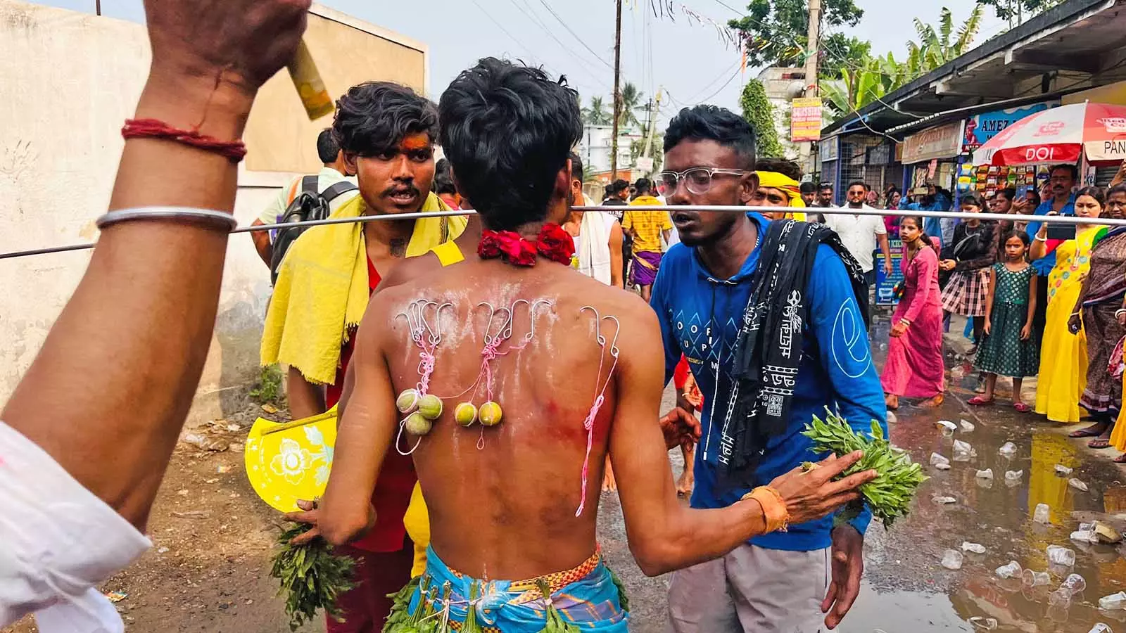 Devotees pierce their skin, tongue, or cheeks with vel (spears) as they undertake a religious procession from Olaichandi temple to Sheetala temple.