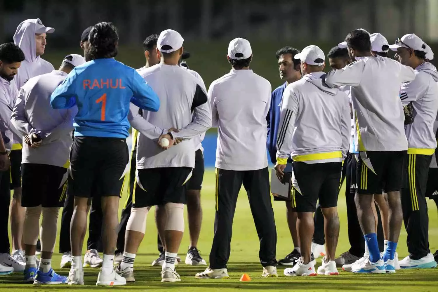Indian team head coach Gautam Gambhir with team players during a practice session ahead of their ICC Champions Trophy match against New Zealand, at ICC Academy Ground No 2 , in Dubai, UAE, Friday, February 28. PTI