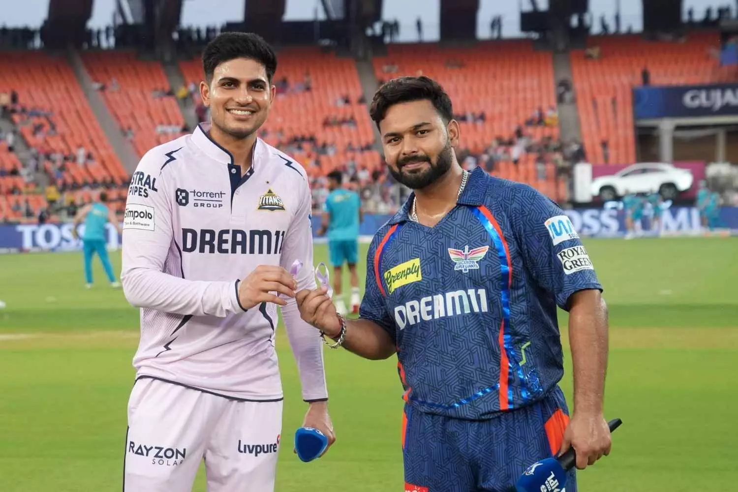 Gujarat Titans (GT) captain Shubman Gill (left) and Lucknow Super Giants (LSG) skipper Rishabh Pant at the toss. Photo: BCCI