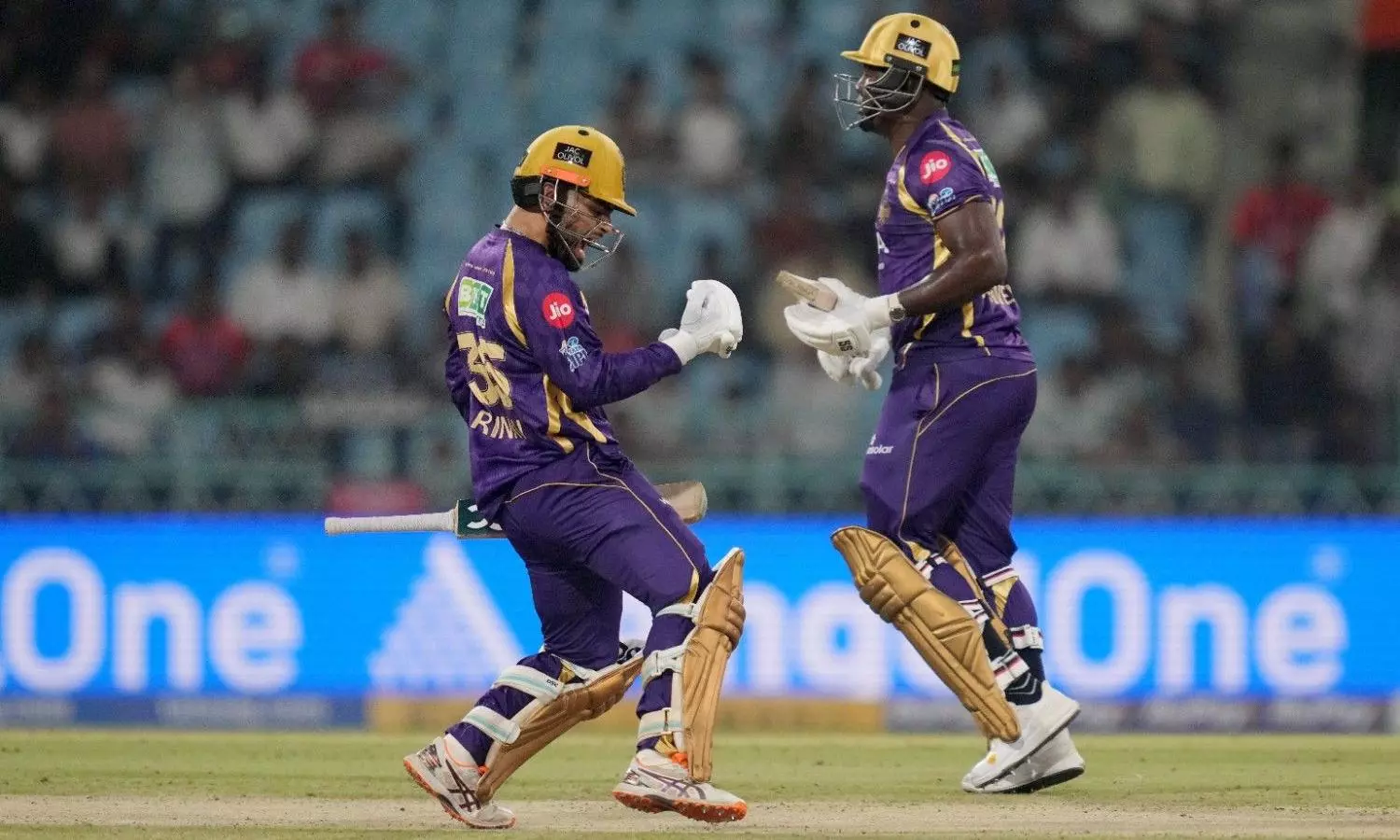 Kolkata Knight Riders' Rinku Singh, left, and Rovman Powell celebrate after winning their IPL 2026 match against Lucknow Super Giants in a super over, in Lucknow, on Sunday, April 26. PTI