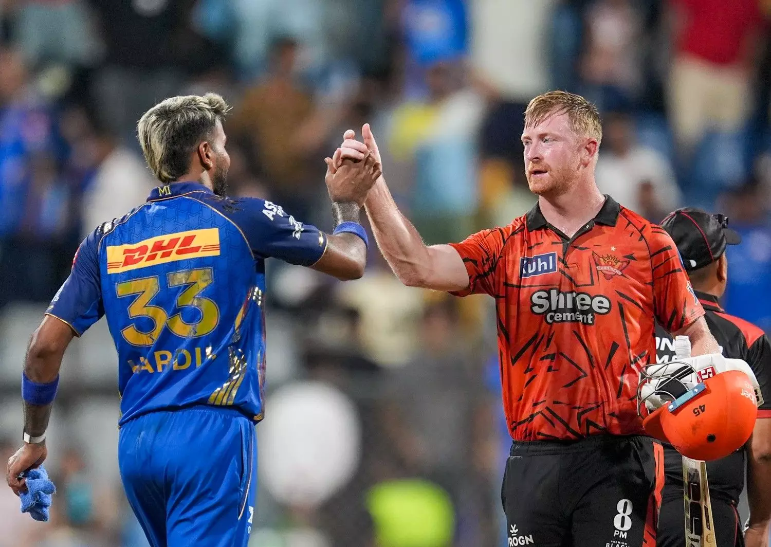 Sunrisers Hyderabad's Heinrich Klaasen, right, shakes hands with Mumbai Indians' captain Hardik Pandya after his team's win during an IPL 2026 match, in Mumbai, on Wednesday, April 29. PTI