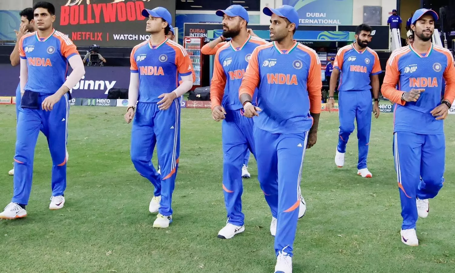 India captain Suryakumar Yadav (3rd right) leads the team onto the field during an Asia Cup 2025 game. File photo: X/@surya_14kumar