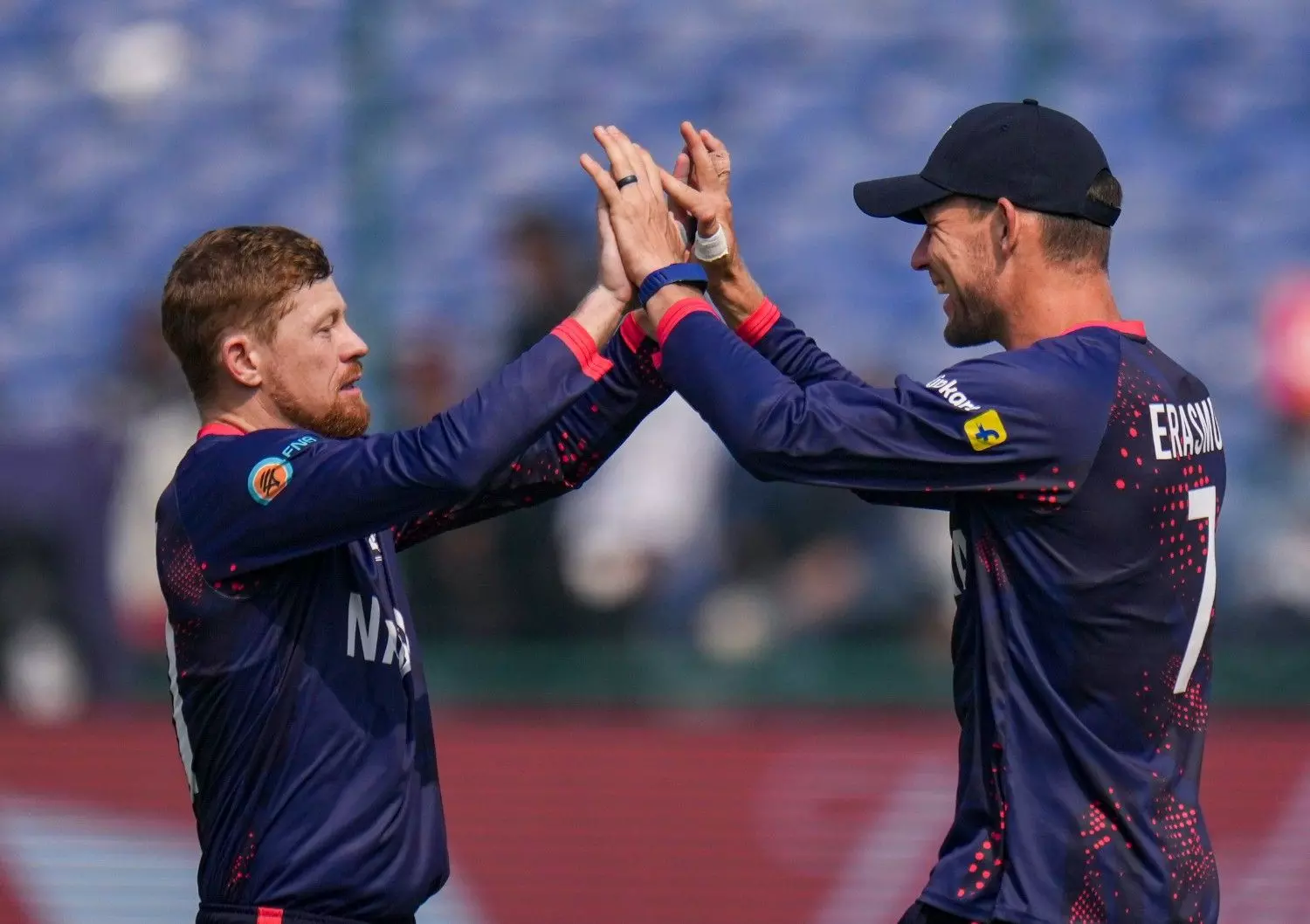 Namibia's Bernard Scholtz, left, celebrates with captain Gerhard Erasmus after taking the wicket of Netherlands' Max O'Dowd during the ICC Men's T20 World Cup 2026 cricket match between Namibia and Netherlands, at Arun Jaitley Stadium, in New Delhi, Tuesday, February 10. PTI